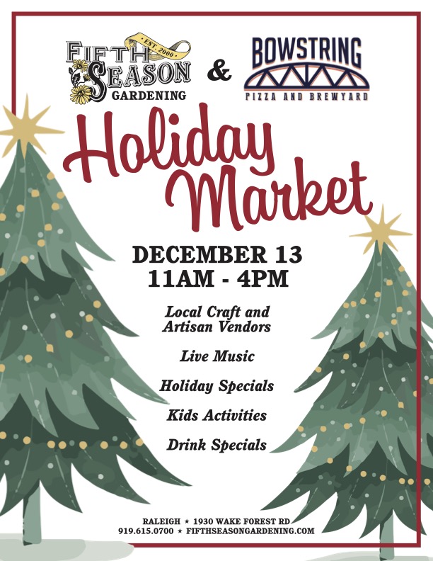 Join us and our neighbors, Bowstring Pizza & Brewyard for our Holiday Market on December 13! The event will take place from 11am – 4pm and will include local craft and artisan vendors, live music from Alex Lawhon, holiday deals at Fifth Season, activities for the kids, and drink specials.